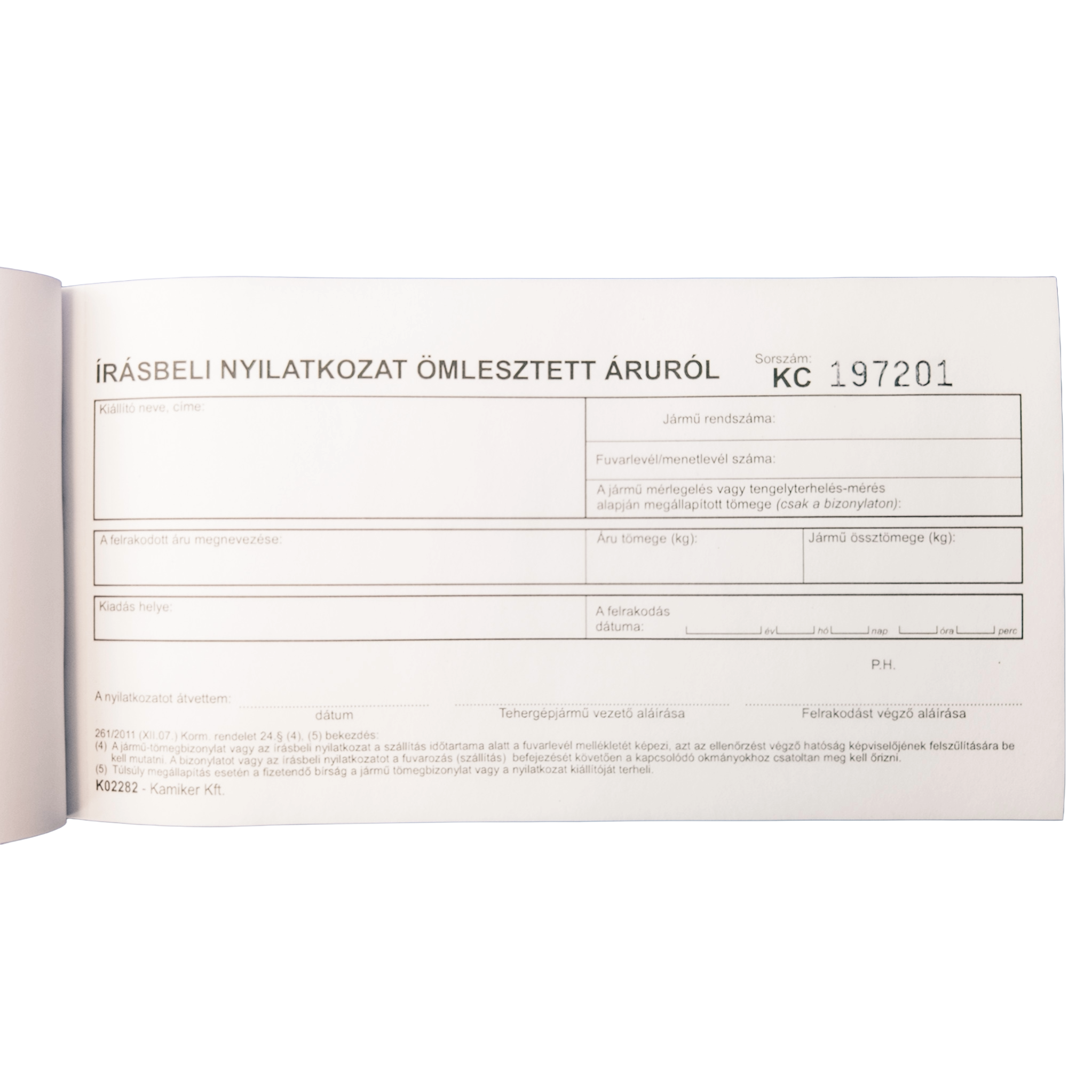 Declaration form for bulk goods transport in a 50×2 sheet pad. Legally compliant and suitable for official inspections.